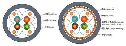 | 5e category solid polyethylene insulated and polyvinyl chloride (flame retardant polyolefin) sheathed horizontal Stranded inner cable with shielding. | ? | |
